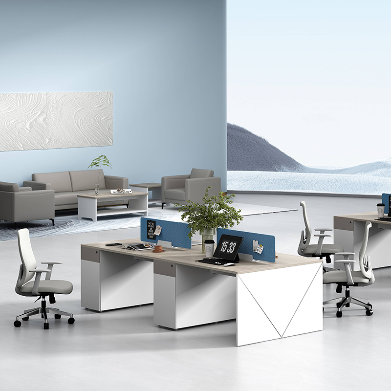 1、基材:符合E0級標準的MFC板材 2、支撐腳V造型鑼工藝線,涂黑色 3、線盒:多功能線盒(夾屏風、出線孔一體) 4、支撐柜:抽屜/主機收納/機械鎖 5、配有過線系統/6個86插座 6、桌屏布顏色:藍色