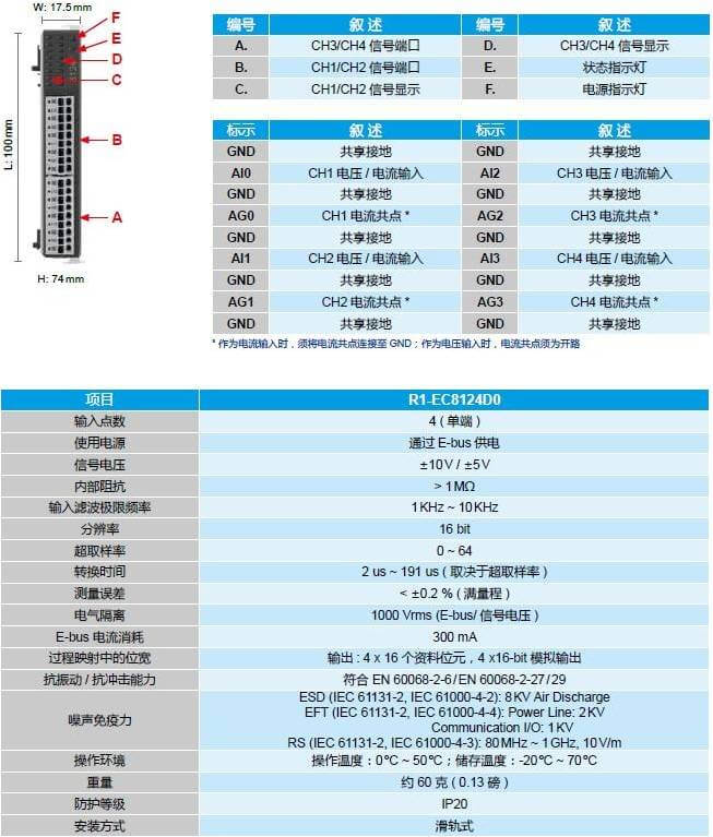 EtherCAT 4 通道模擬輸入擴展模塊 - R1-EC8124D0
